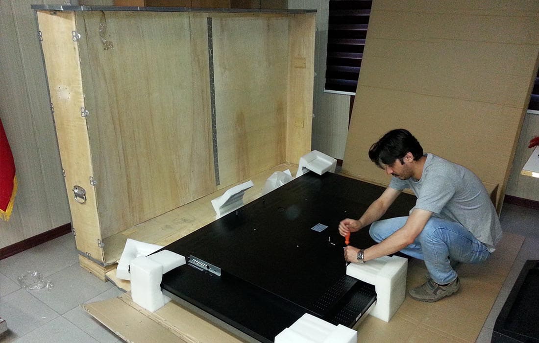 تمام کامپیوترهای لمسی کاواک از ابعاد ۵۵ اینچ تا ۹۸ اینچ در بستهبندی مشابه تصویر بالا وارد کشور میشوند. یک بستهبندی ایمن از ورقهای سهلایه چوبی با فریمی از آهن گالوانیزه که خیال ما را از بابت احتمال آسیب به تجهیزات، راحت میکند.