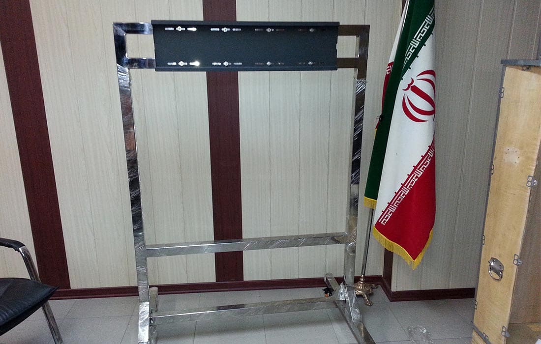 بعد از باز کردن جعبه چوبی، شاخکهای براکت نصب دیواری را روی بدنه دستگاه نصب میکنیم و سپس صفحه دیواری براکت را روی دیوار یا پایه متحرکی که از قبل طراحی و ساخته بودیم، نصب میکنیم. در تصویر پایین، پایه متحرکی را میبینید که اینبار با بهرهگیری از تجربه ساخت پایهای در شهر زاهدان و برای استودیوی هواشناسی شبکه سپهر، از جنس استیل ساخته شد؛ تا هم شکیلتر و هم مقاومتر باشد.