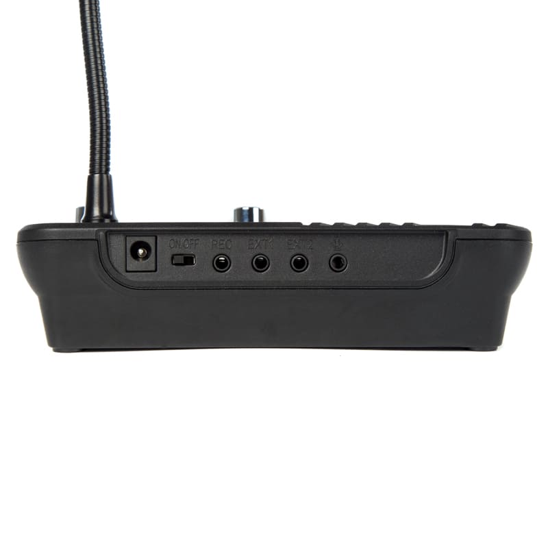 ورودی اتصال میکروفون یقه ای / خروجی به اکستنشن یا یونیت فرعی شماره دو / خروجی به اکستنشن یا یونیت فرعی شماره یک / خروجی شنود یا ضبط مکالمات / کلید خاموش و روشن کردن دستگاه / ورودی منبع تغذیه ولتاژمستقیم 12 ولتی