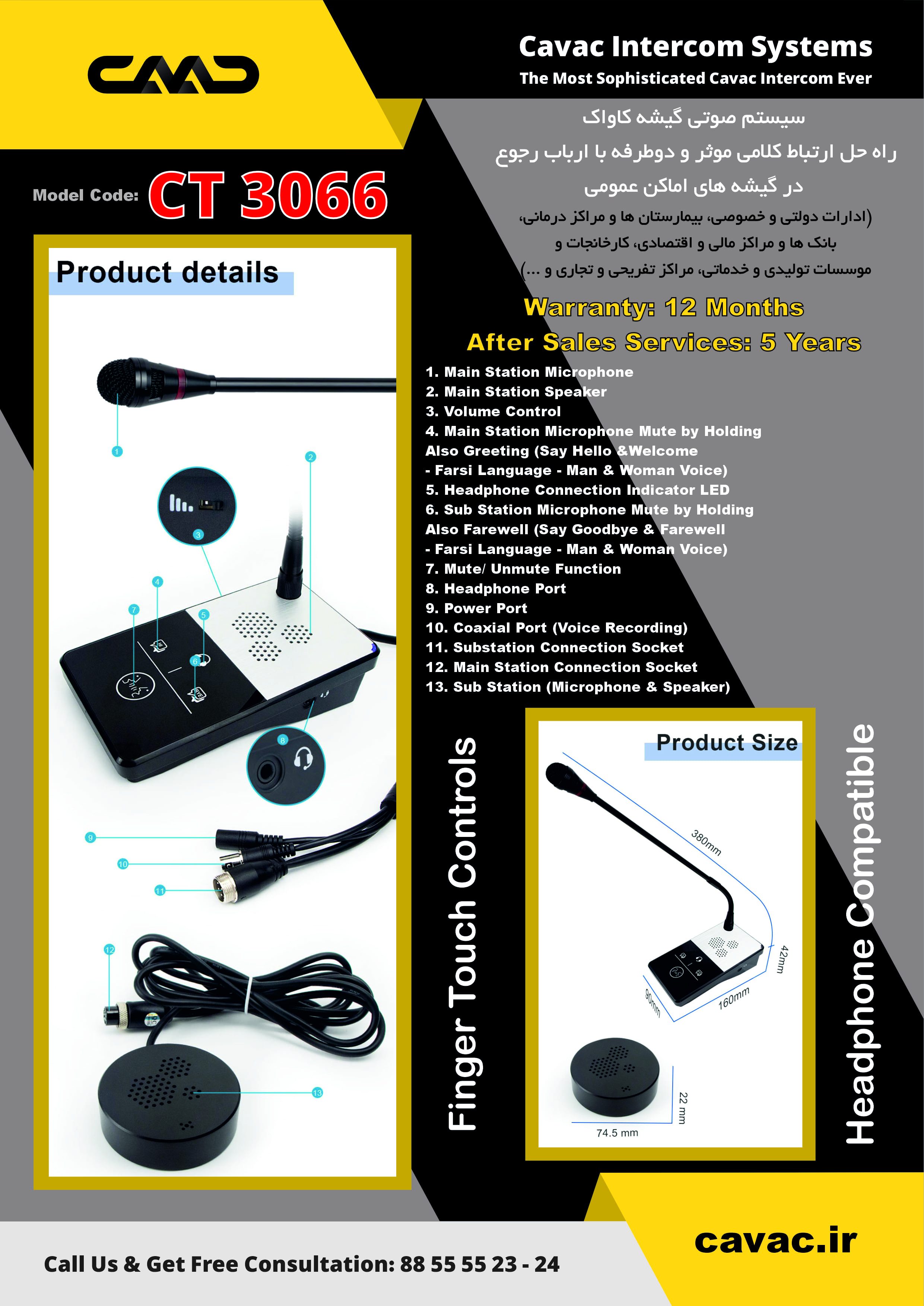 در تمام مدل های دیگر موجود در بازار کنترل حجم صدای بیرونی و داخلی و یا خاموش و روشن کردن دستگاه و همچنین فعال و غیر فعال کردن میکروفون ها از طریق قطعات الکترومکانیکی انجام می شود که طبیعتا به مرور زمان مستهلک می شوند. در مدل CT 3066 همه ی موارد فوق به وسیله ی یک کنترل پنل لمسی و با کمترین استهلاک صورت می پذیرد.