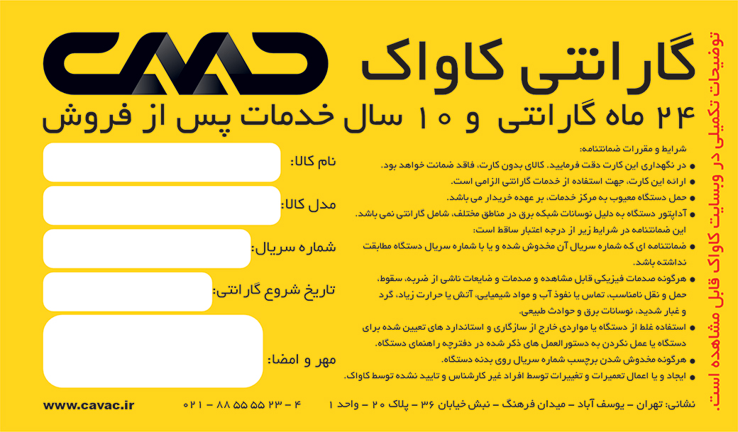 در هنگام خرید محصول از فروشنده بخواهید اطلاعات کارت گارانتی را تکمیل و آن را به مهر شرکت کاواک ممهور نماید. بدون کارت گارانتی قادر به دریافت خدمات رایگان گارانتی نخواهید بود.